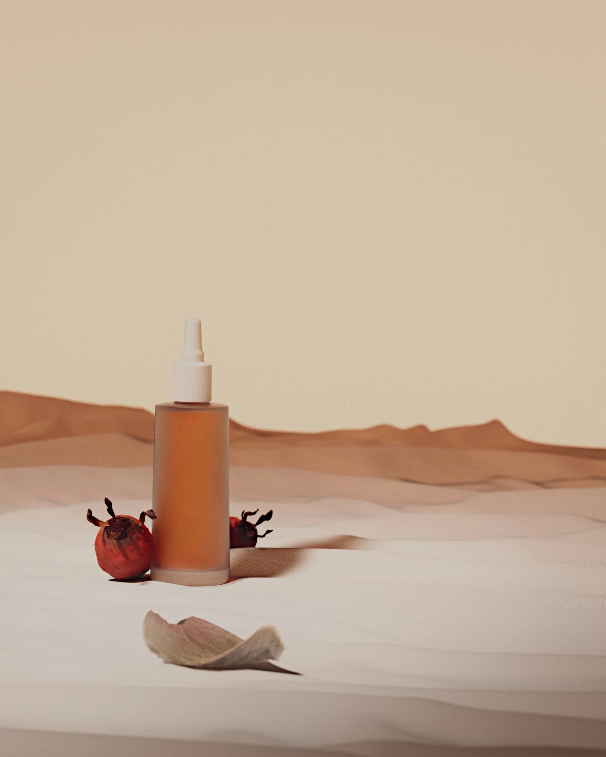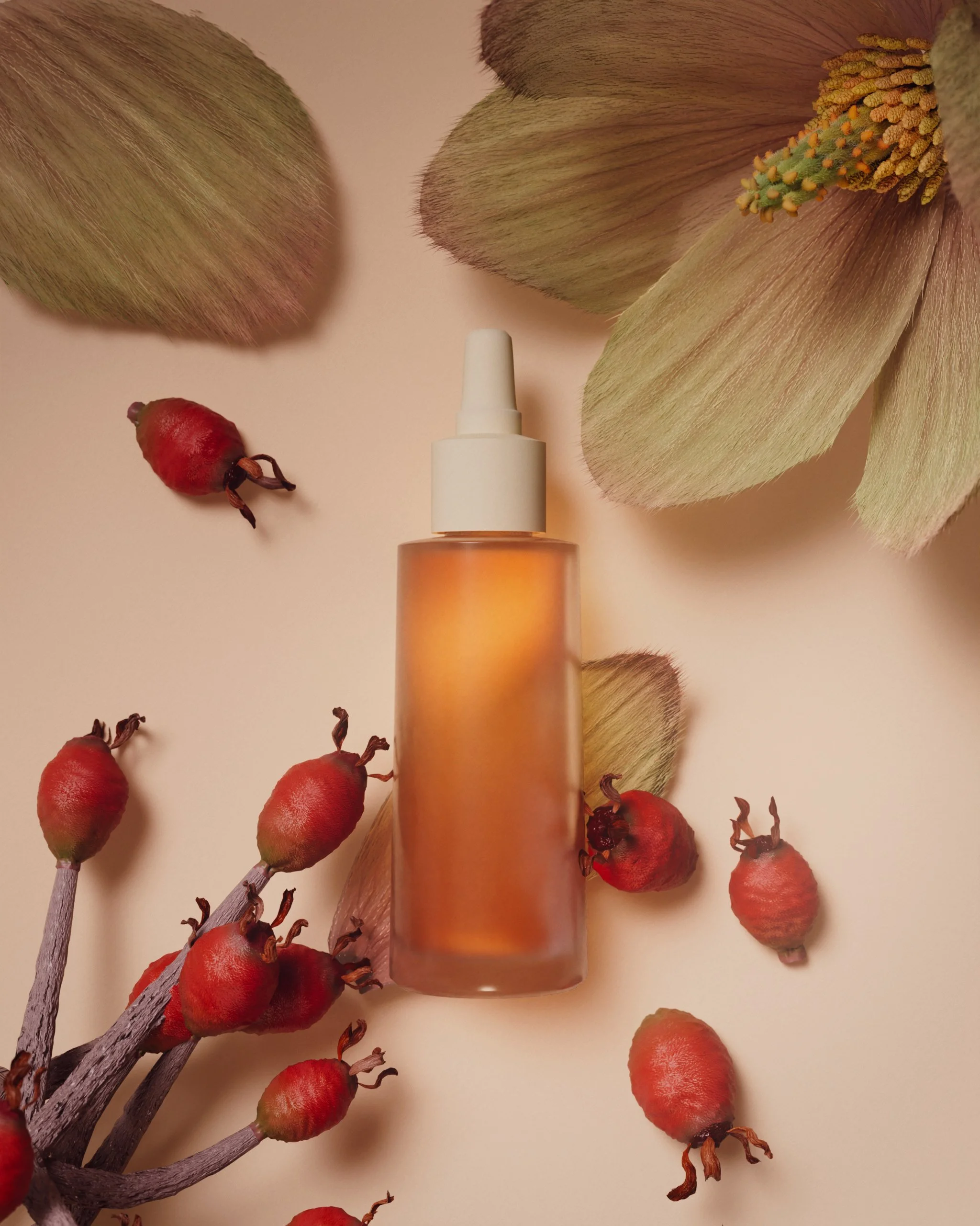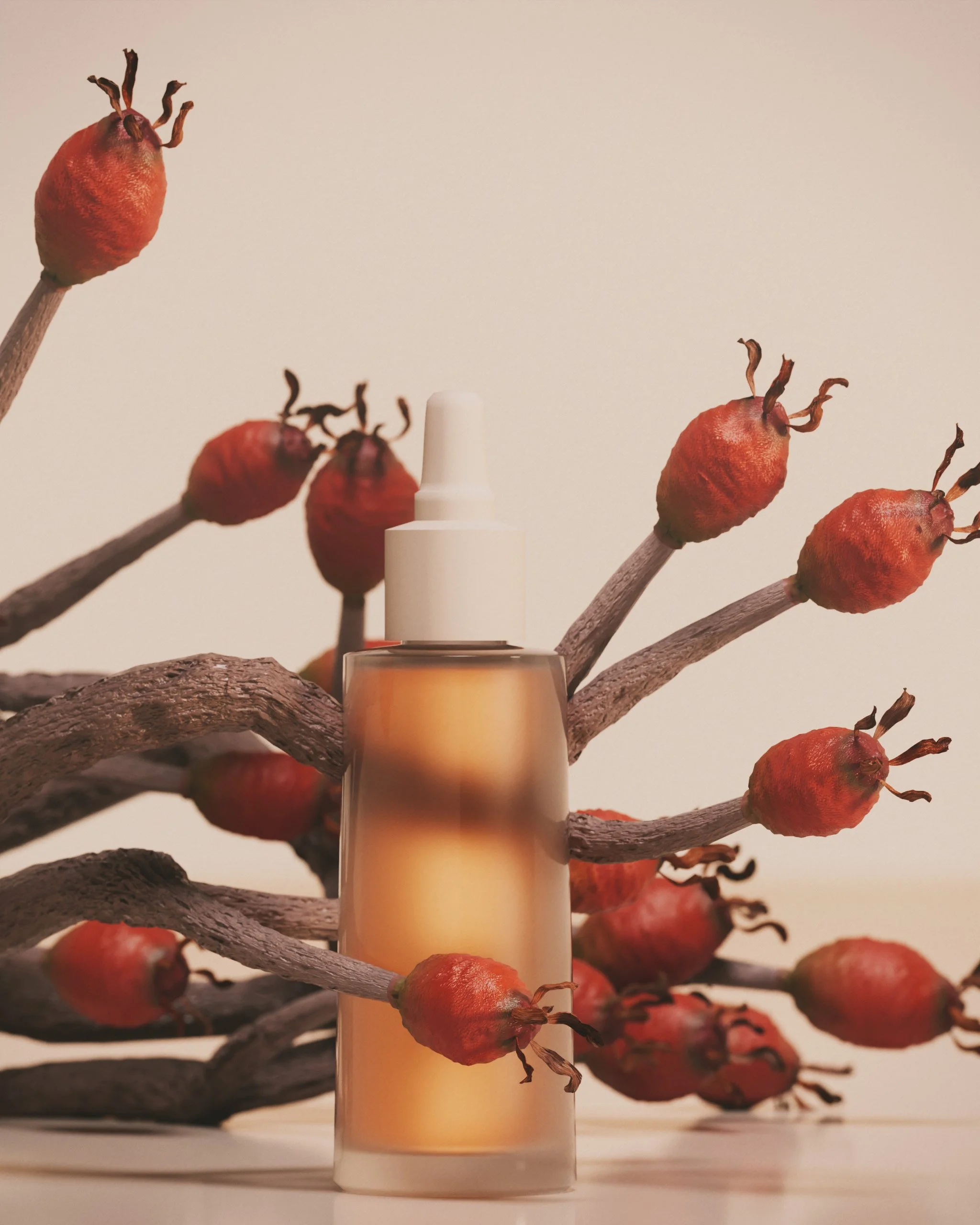 The most saturated image in the series — intentionally. The rose hip branch was built with a Vellum wire solver so it settles naturally against the ground. The hips radiate outward behind the bottle, creating depth without symmetry. This shot earns its warmth because everything else in the series is restrained.