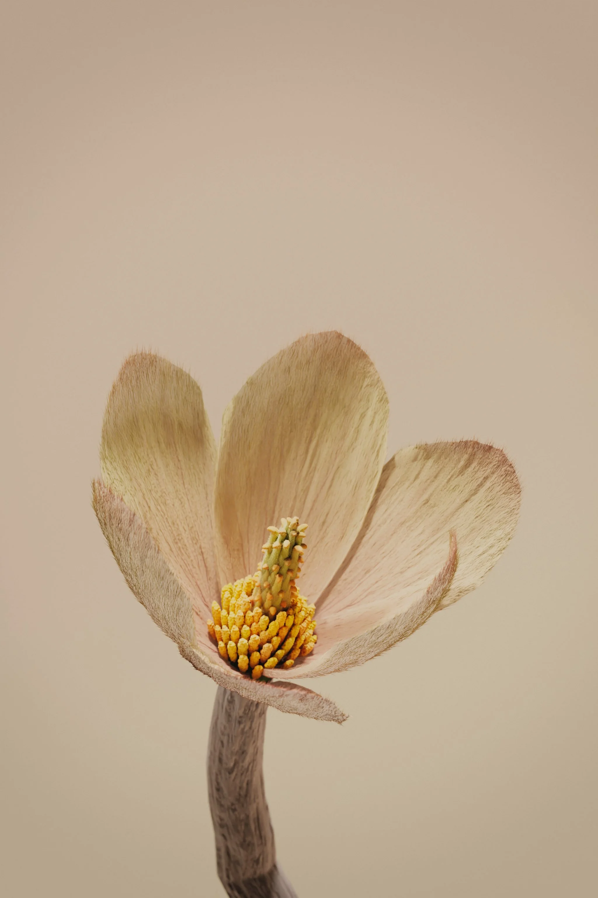 A fully procedural magnolia blossom — phyllotaxis stamen system, concentric petal whorls, SSS MaterialX shading, Vellum hair on the petal surface. The stem curves naturally because it was solved, not sculpted. Single diffused top-left light, nothing else. The restraint in the lighting is as important as the geometry.
