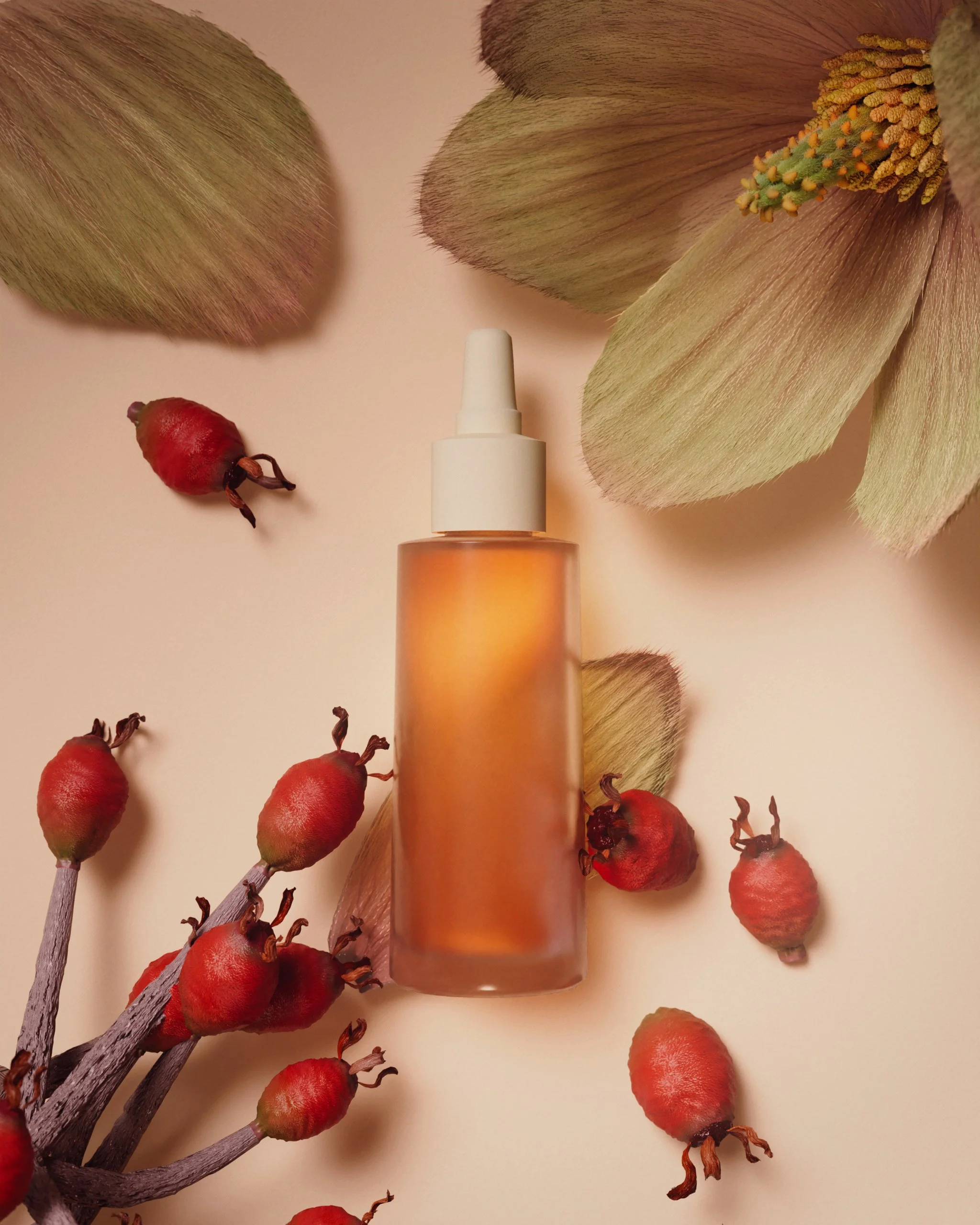 The most saturated image in the series intentionally. The rose hip branch was built with a Vellum wire solver so it settles naturally against the ground. The hips radiate outward behind the bottle, creating depth and some dynamic movement